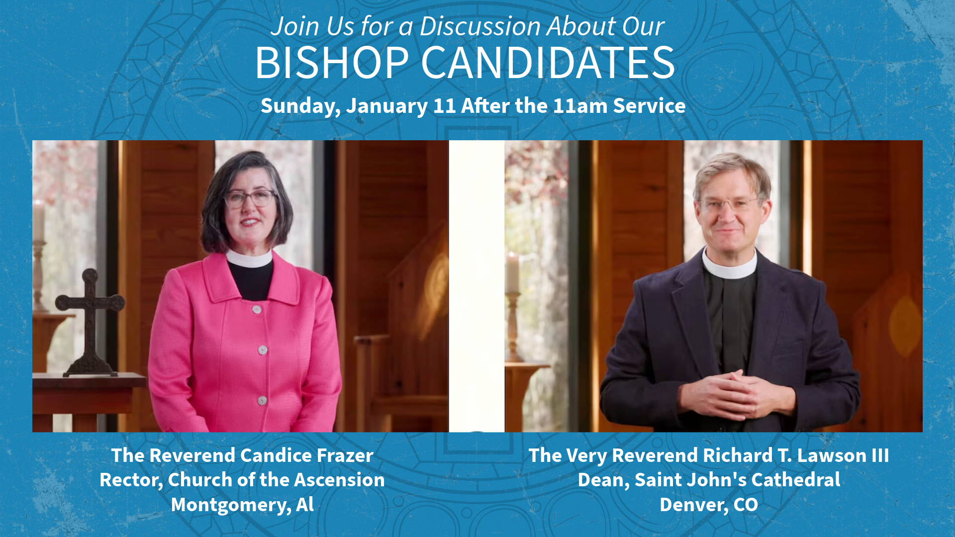 A new chapter is beginning for the Diocese of Alabama. As many of you know, our Diocesan Bishop, the Rt. Rev. Glenda Curry, will retire later this year. As part of the search for the 13th Bishop of Alabama, several hundred Episcopalians gathered on January 3 at St. Luke’s in Mountain Brook for a bishop search walkabout. A walkabout is for bishop candidates to speak openly about their vision and respond to questions from across the diocese. Following our 11am worship service this Sunday, January 11, the Rev. Kelley Hudlow and the Rev. Ed Bacon will lead a conversation about what was heard, how the election process works, and what comes next. Deputies who will vote in the election will be part of the conversation. A light lunch will be served. Join us in the Great Hall for this thoughtful and important conversation. Watch the walkabout video below. And learn more about the process here: https://www.albishopsearch.org